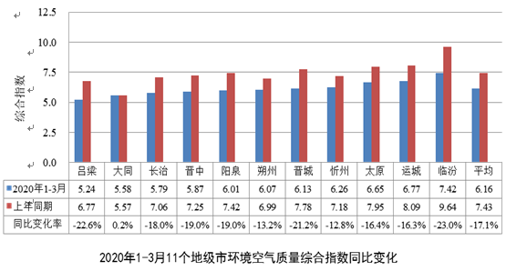 2020年3月,全省11个市环境空气质量全面改善,综合指数同比均下降,降幅介于10.6%~28.3%之间。其中改善幅度较大的城市为大同(下降28.3%)、朔州(下降27.4%)、忻州(下降20.2%)。